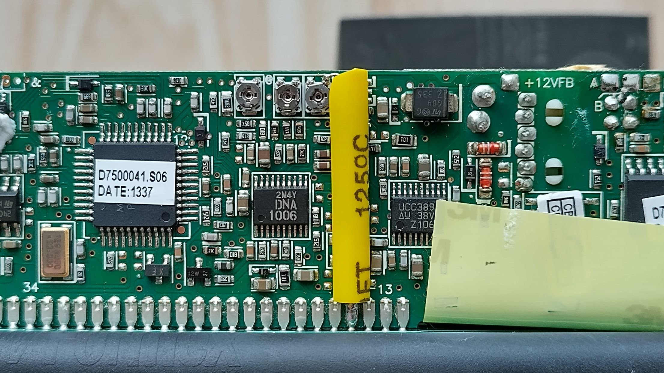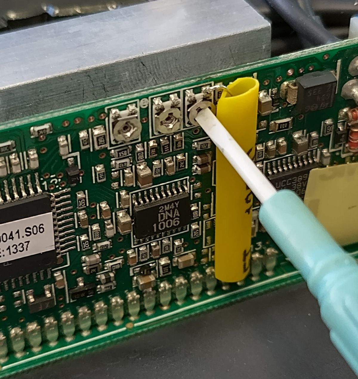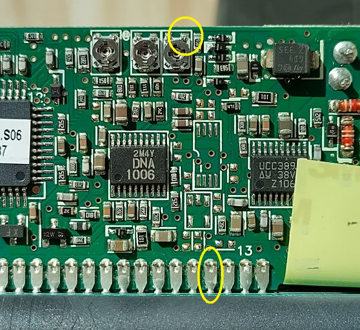 Gelötet wird an der unteren Kontaktreihe am 4. Pin von rechts (gelbes Oval) und am rechten oberen Anschluss vom rechten Poti (gelber Kreis)